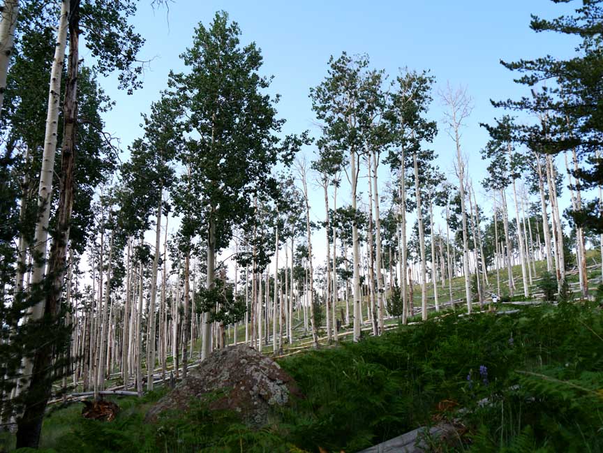 Description: When it's warm in Sedona, we like to hike in the high country. The Kachina Trail is a favorite because the altitude of 8900 - 9300 feet makes for a cool hike. The trail is easily followed although there aren't any cairns to mark the way. You'll cross large fields of tall ferns in the summer and enjoy the shade provided by the Pinion Pines and Aspens.